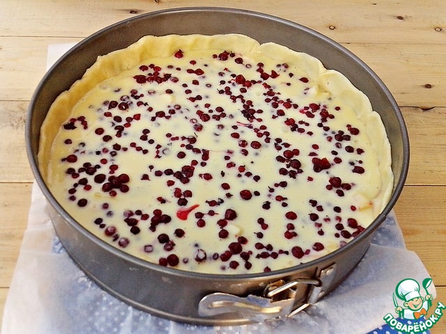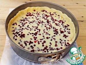 Вылить сырно-яичную массу и высыпать 2-ю часть брусники.