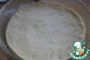 Тесто раскатать и выложить в форму (диаметр 24 см), я разделила тесто на 2 части и приготовила 2 разных пирога. Наколоть тесто вилкой в нескольких местах.