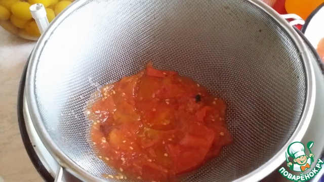 4. В полученную томатную массу добавить соль и масло. Размешать все до растворения соли. Залить в противень с высокими бортами! У меня получилось два глубоких противня! И поставить в духовку на максимальную температуру! У меня духовка на 275 градусов, а по времени приблизительно 1 час 10 минут! Периодически помешивать!