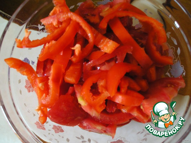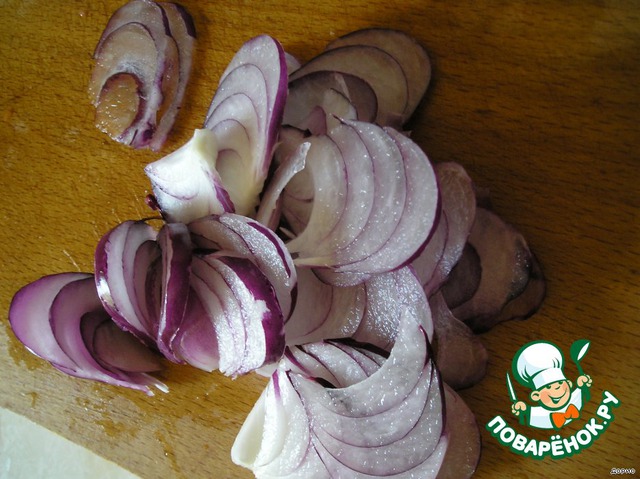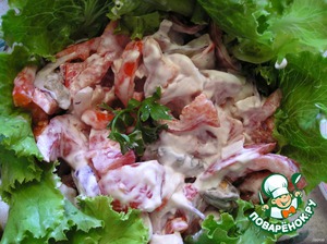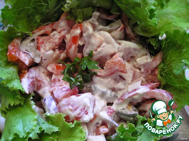 Заправляем сметанкой и украшаем листьями салата. Я не солила. Это по желанию. подаём! Трудно четыре порции не превратить в две. Оторваться сложно.