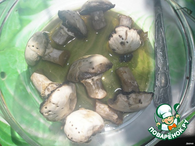 Грибочкм чистим, моем. В 2-3 местах прокалыкаем вилкой. Кладём в огнеупорную посуду и отправляем в микроволновку на 3 минуты. Мощность 600-800.