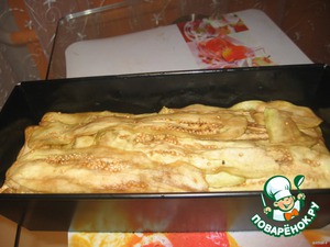 Форму смазываем оливковым маслом, выкладываем ломтиками баклажанчиков, слой песто, сырный соус.