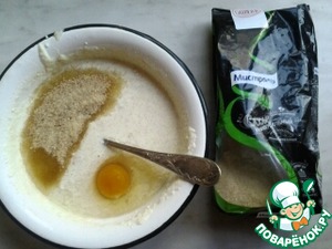 • Манную крупу залить кефиром на 2-3 часа. Добавить сахар и яйцо, перемешать до растворения сахара. Добавить апельсиновую цедру, корицу и соду.