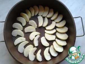 • Яблоки очистить, порезать дольками, уложить в форму. Сверху вылить тесто.