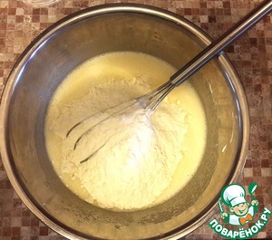 Всыпать муку, смешанную с разрыхлителем и вымесить гладкое тесто. Оно чуть гуще, чем тесто для кексов