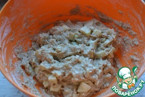 • В сухую смесь добавить яблочный сок, яйцо и яблоки. Все перемешать.
