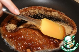 В большой сковороде растопить масло 40 г добавить корицу, цедру и сахар, все хорошо перемешать.