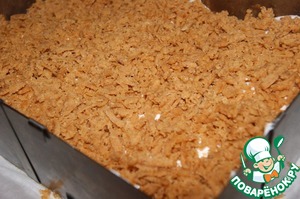 Дно формы 23х33 см застелите пекарской бумагой. Выстелить кусок теста, который помещали в холодильник по всей поверхности расправляя его руками. Сверху посыпать сухарями.