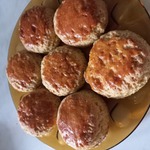 вот традиционные сконы: 250гр самоподходящей муки (блинная) 1/2 ч.лож соли., 1ч.л бикорбонат сода, 40гр сахара, 40гр масла или маргарина и 150мл пахты, молока или йогурта. смешать сухие продукты и добавить кусочки масла и перетереть в крошку. Сделать в центре ямочку и влить пахту или молоко или йогурт. Замесить мягкое тесто. обсыпать стол мукой и раскатать тесто толщиной 1,5 см. Затем вырезать формочкой с волнистами краями небольшие кружочки. Выпекать сконы 10 - 12 минут до золотистого цвета, предварительно смазав верх желтком взбитым с 1 ст.л воды.