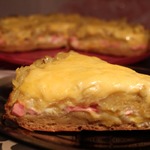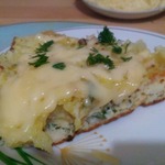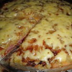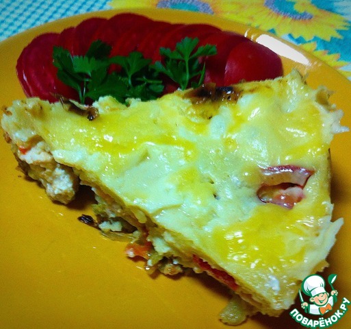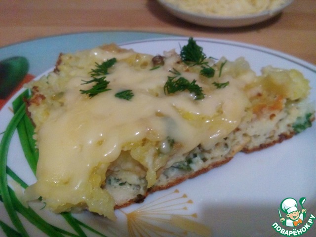 Пока она ещё горячая, выкладываем на нее заранее натертый на крупной терке сыр и после того, как он расплавится, можно звать всех к столу!! Наша А-ля пицца "Вверх тормашками" - готова!