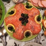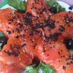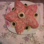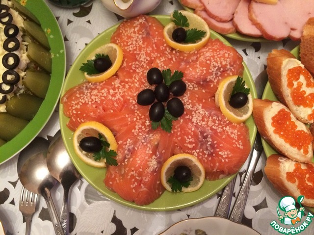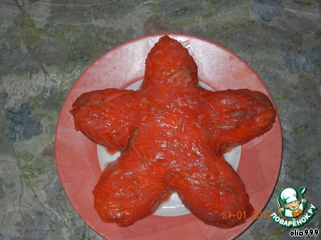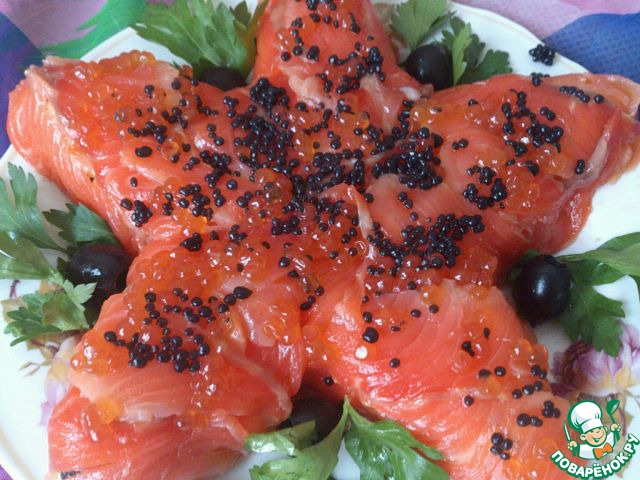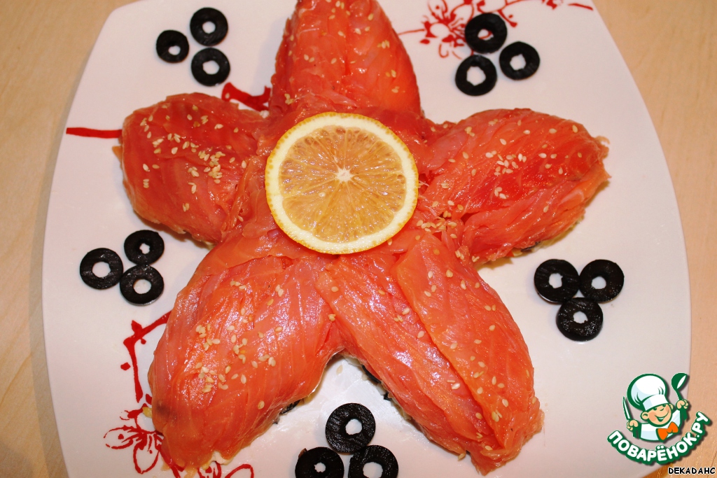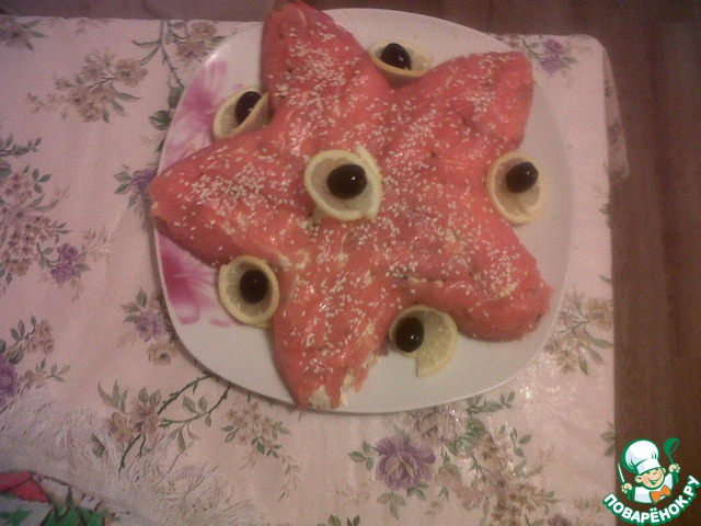 Лучше покупать рыбную нарезку, тогда легко просто выложить ее сверху ровненько и аккуратненько. Но у меня была своя соленая форелька, и я ее тоненько нарезала, правда, были некоторые погрешности, но их можно подправить. В идеале нужно посыпать нашу звезду кунжутными семечками, но их не оказалось в маркете, и я припудрила желтком. Правда он немножко впитал рыбные соки, так что ищем кунжут (я уже запаслась наперед)!!!