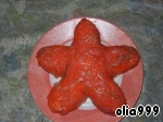 Готовим соус: сметана и майонез в равных частях, немного лимонного сока, соль по вкусу. Смешиваем сыр, яйца, креветки, маслины с соусом, выкладываем ложкой на блюдо в виде звезды.