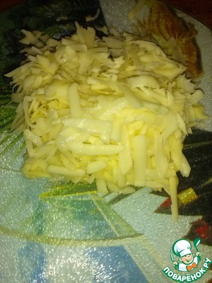Для начала потрем картофель на крупную терку. В среднем на блюдо идет 5-6 не очень крупных картофелин. Можно взять больше или меньше, делая основу толще или более тонкой.