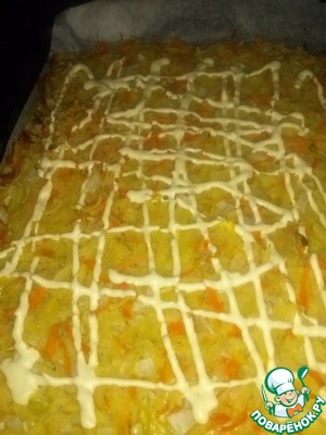 Через 20 минут открываем духовку, достаем противень. Можно смазать основу майонезом. Можно этого и не делать. Запеканка все равно не будет сухой. Я сделала майонезную сетку.