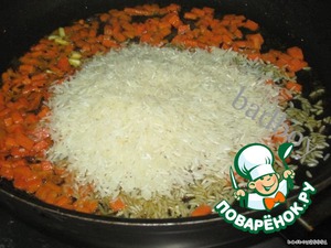 Добавляем простой, самый обычный рис (ОБЯЗАТЕЛЬНО ЗАПОМНИТЕ КАКОЕ КОЛИЧЕСТВО) и обжариваем минут 7-10, пока рис не начнет менять цвет.