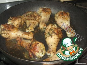 В освободившуюся сковородку кладем куриные ножки, жарим до румяной корочки,
