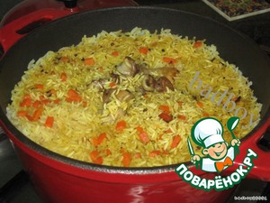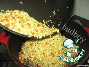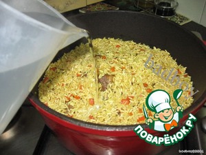 Выкладываем рис сверху на наше мяско и вот тут мы должны вспомнить все обещания, которые мы давали еще до свадьбы,
