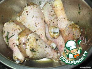 Куриные ножки (или другие части курицы) помоем, обсушим, посолим и замаринуем любыми вашими любимыми специями.