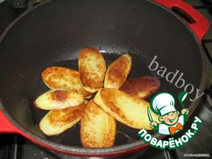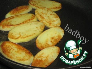 Сковороду нагреем, нальем немного масла и кладем картофель, жарим быстро с двух сторон до коричневой корочки.