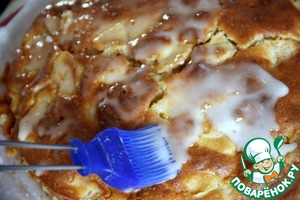 Зарумянившийся пропеченный пирог вынуть из духовки, дать ему немного остыть, пройтись тупым ножом по бортикам, освободить пирог от кольца. Аккуратно перенести теплый пирог вместе с бумагой для выпечки на блюдо. Смазать глазурью.