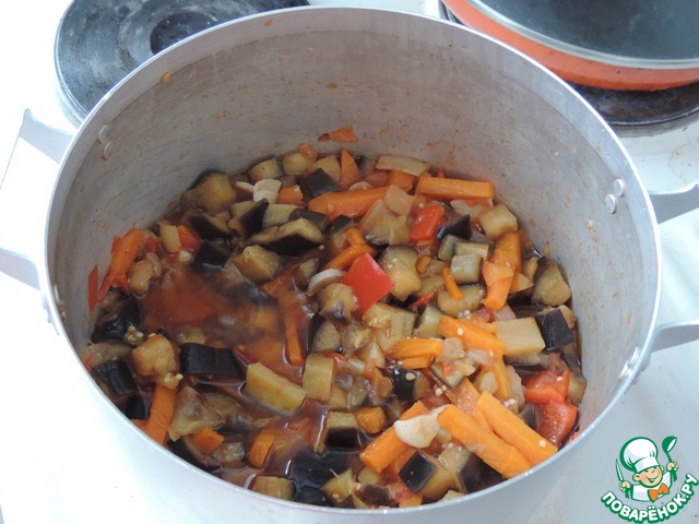 И, наконец добавляем баклажаны и чеснок. Хорошенько перемешиваем. Получается, что баклажаны как бы в соусе. Перемешали, накрываем крышкой убавляем огонь до минимального и тушим минут 15-20. Вид уже настолько аппетитный, что не дожидаясь полной готовности хочется зачерпнуть ложечку и слопать.