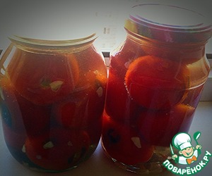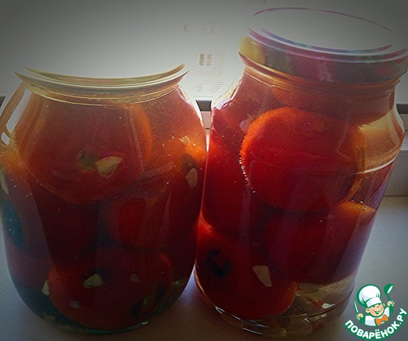 Пока жарятся помидоры простерилизуем наши баночки и крышки. В стерилизованную банку кладем соль, сахар и уксус ( на дно 2 ст. л. и 1 ст. л. сверху, под крышку). Плотно укладываем горячие помидоры. Туда же кладем мелко нарезанный чеснок. Заливаем доверху кипятком, выливаем оставшуюся ложку уксуса и закрываем. Аккуратно перевернем банку, пару раз, для растворения сахара и соли. Затем укутаем банки в плед до остывания. Таким образом можно заказывать болгарский перец целиком, вместе с семенами, тоже очень вкусно. Приятного аппетита!