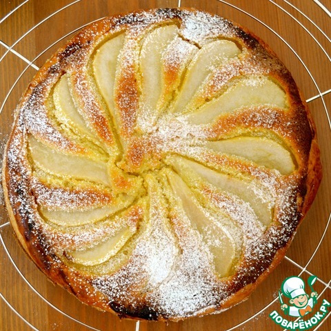 Выложить груши по поверхности пирога по кругу. Присыпать сверху слегка сахарной пудрой.