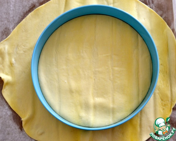 Духовку включить разогреваться на 190°C. Готовое слоёное тесто развернуть. С помощью трафарета вырезать из него диск диаметром 20-22 см (можно использовать форму для выпечки соответствующего размера как трафарет).
