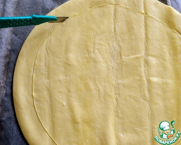 Переложить диск слоеного теста на противень и сделать неглубокий надзрез по всей кромке круга, отступив от края 1,5-2 см.