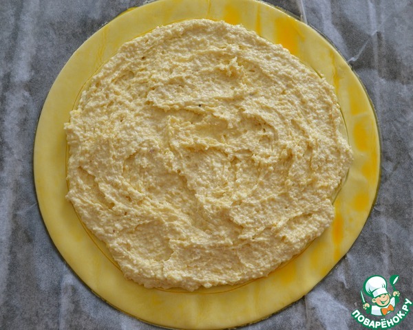 Яичный желток слегка взбить с 2 ст. л. воды и смазать кромку диска. Выложить в центр теста крем франжипан, оставив нетронутым смазанный яйцом край. Хорошо разровнять.