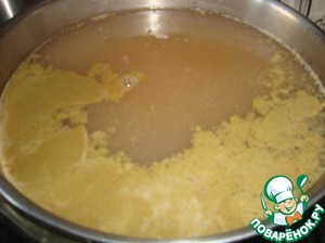 Ставим кастрюлю с соком на плиту и на самом маленьком огне, при закрытой крышке нагреваем его 30 минут. (Этот процесс немного похож на пастеризацию). На этом этапе по желанию можно добавить сахар по вкусу. Я не добавляла, т. к. мне нравится кисло-сладкий виноградный сок. За время прогрева образовывается "пенка", снимаем ее ложечкой. Вся она конечно же не снимется, ну да это не страшно. Через 30 минут снимаем сок с плиты и остужаем.