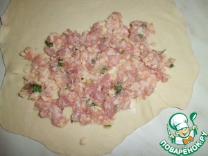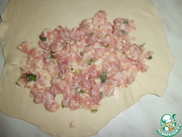 Тесто делим на 8 частей, раскатываем и выкладываем тонким слоем начинку.