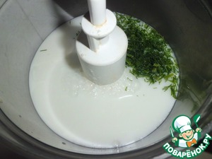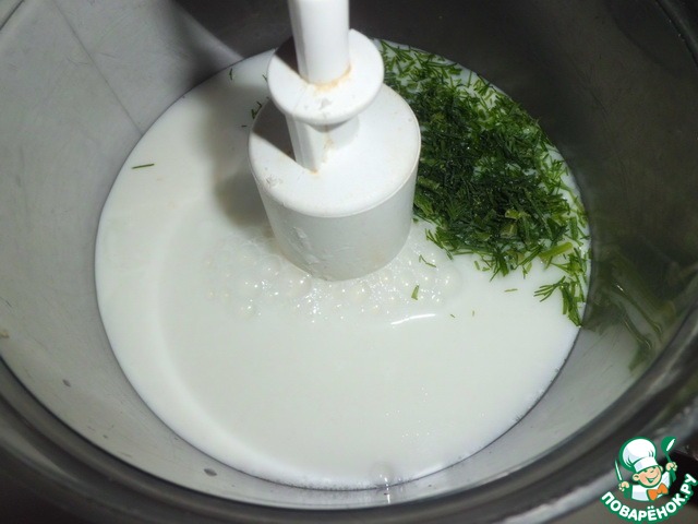 Кефир смешиваем с кипяченой водой, укропом, солью.
