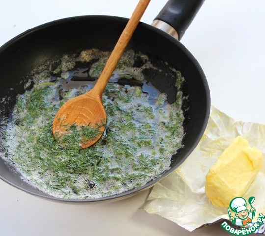 Разогреваем в сковороде небольшой кусочек сливочного масла, высыпаем нарезанный укроп и слегка притомим зелень.