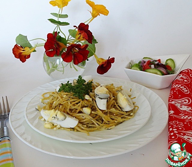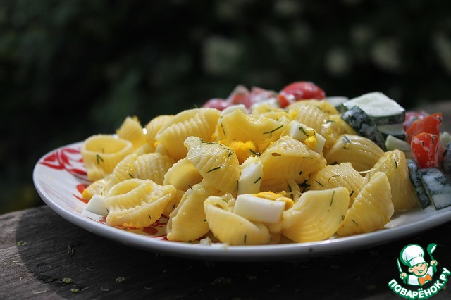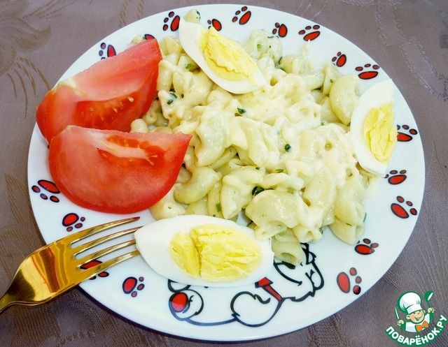 Быстрый завтрак, а может и ужин, готов. Подать макароны с салатом из свежих овощей.