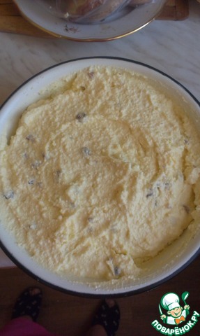 В центре делаем лунку, туда засыпаем изюм и измельченные орехи.