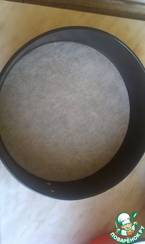 Когда масса набухла, застилаем дно формы пергаментом. Тем временем разогреваем духовку.