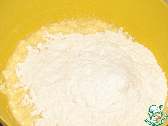 Смешиваем творог с яйцами, маслом, сахаром, ваниином и гашеной содой.