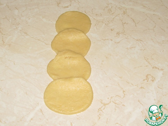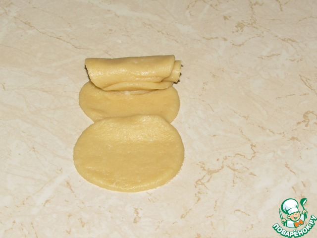 Тесто отдохнуло, достаем его из холодильника и оставляем при комнатной температуре минут на 20. Далее начинаем раскатывать тонкий пласт, чем тоньше, тем лучше. Вырезаем стаканом кружочки.