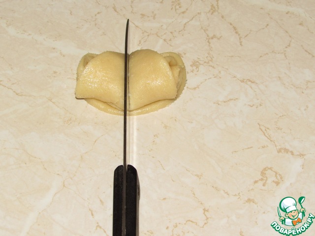 Получается 2 розочки. Слегка прижимаем основание розочек, чтоб они не распались во время выпечки.