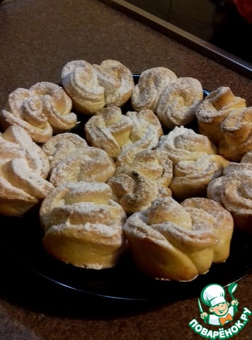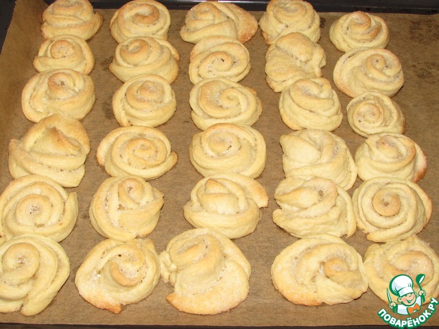 Получившиеся розочки складываем на противень, покрытый пергаментной бумагой и отправляем в предварительно разогретую духовку до 180 градусов на 15-20 минут.