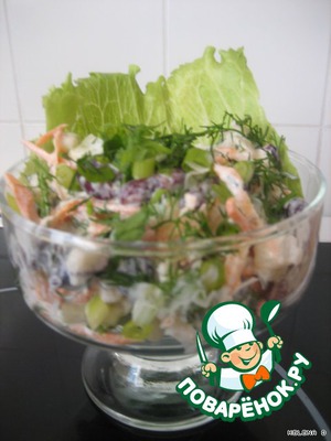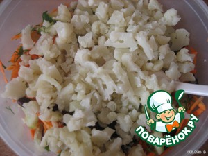 • Отварную капусту мелко измельчаем и добавляем в салат