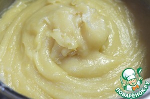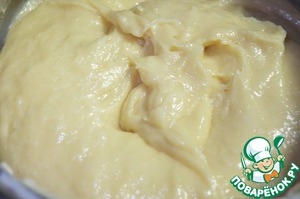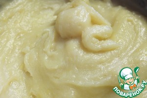 В кастрюльке доводим до кипения молоко, воду, сливочное масло. Всыпаем муку, смешанную с сахаром. Перемешиваем тесто до тех пор, пока оно не начнет отставать от стенок кастрюли.