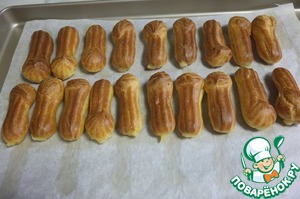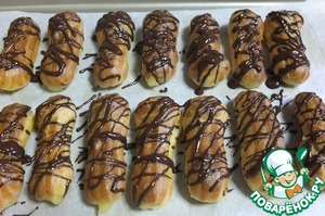 Убираем эклеры в разогретую духовку на 10-15 минут. Затем понижаем температуру до 180 градусов и печем еще 15-20 минут. Вот такие у меня получились эклерчики.