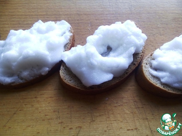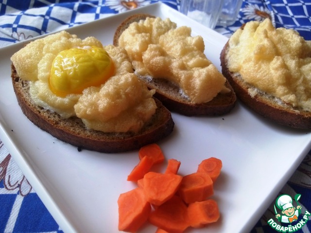 Выложите белок ложкой на кусочек ржаного хлеба, так, чтобы осталась выемка для желтка. Поставьте в разогретую до 160 градусов духовку на 3 минуты, до зарумянивания пиков. Затем выньте и вылейте в серединку желток и еще 3-4 минуты запеките до готовности.