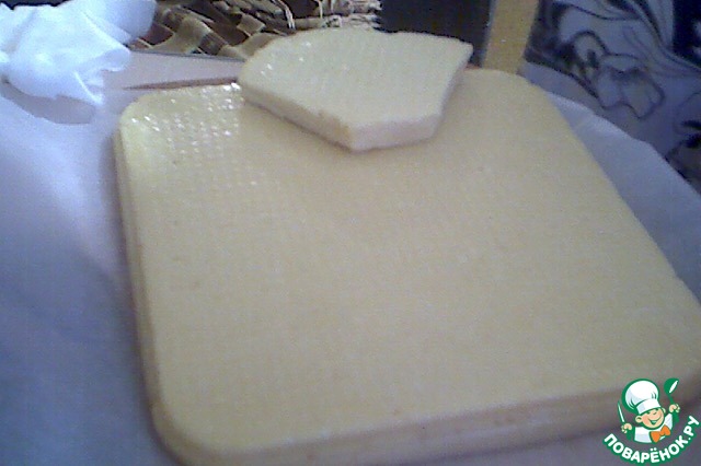 Спустя четыре часа достаем сыр из формы, заворачиваем его в пергаментную бумагу, чтобы она впитала лишний жир.