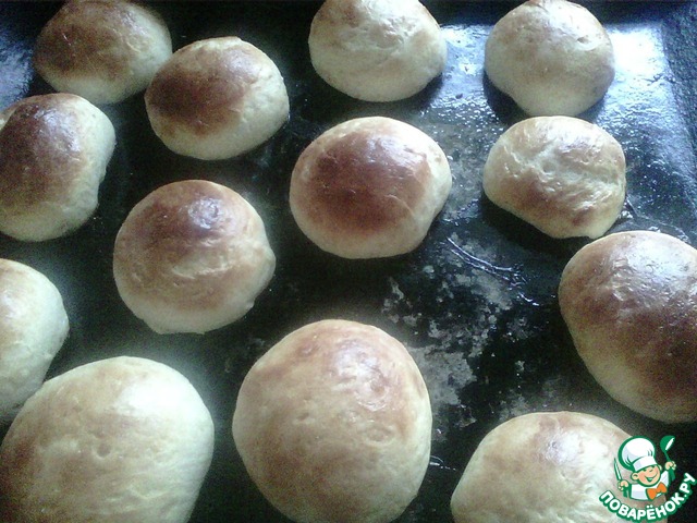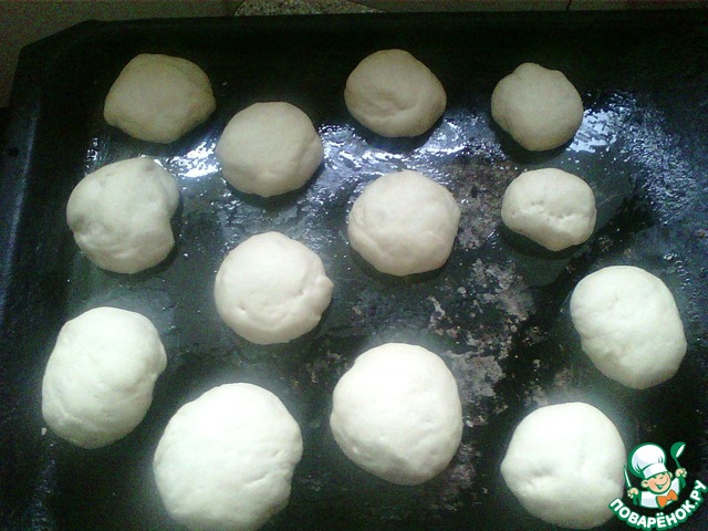 • Разделить тесто на небольшие шарики и оставить на противне (смазанным растительным маслом) на расстойку еще на 30 минут, смазать булочки яйцом смешанным с молоком.