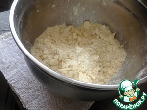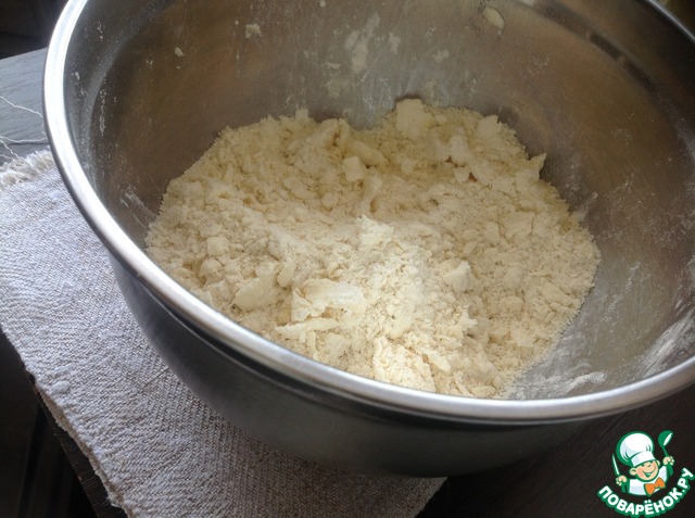 Охлажденное масло растереть с просеянной мукой в крошку.