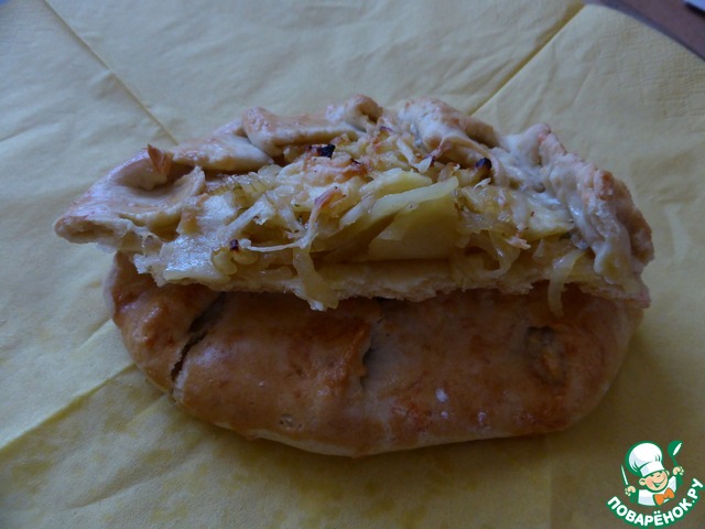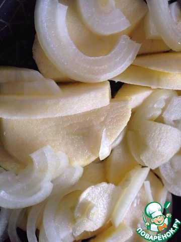 Для начинки: лук нарезать полукольцами, очищенные от кожуры яблоки небольшими ломтиками. Добавить щепотку сахара и обжарить на сливочном масле 5-7 минут.