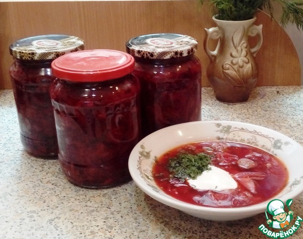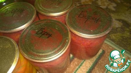 Дорогие наши заботливые мамочки и свекровушки! Если вы переживаете за своих детей, которым вечно некогда приготовить и поесть первого, сделайте для них на зиму эту волшебную заготовку для борща. Зимой ваше любимое чадо (или нерадивая невестка) с благодарностью сварят и съедят этот восхитительнейший борщик, потратив на всё вместе ( и приготовление, и поедание) не больше получаса. Борщ получится очень вкусным, даже если в доме найдётся только вода - на приготовление уйдёт 5 минут. А уж если будет мясо, или курочка, или тушёнка да несколько картофелин - результат превзойдёт все ваши ожидания. Это мой дебютный рецепт на сайте, но размещать его не боюсь, знаю точно, что стыдно мне за него не будет. Рецептом этого чуда со мной поделилась подруга, вот уже 7 лет готовлю борщ только так, получается всегда отлично. Все обожают мой борщик и могут есть его хоть каждый день. Сейчас самый сезон заготовок и нам с вами попариться всё-таки придётся))) - но зимой вы попробуете этот потрясающий борщ и вспомните меня добрым словом.